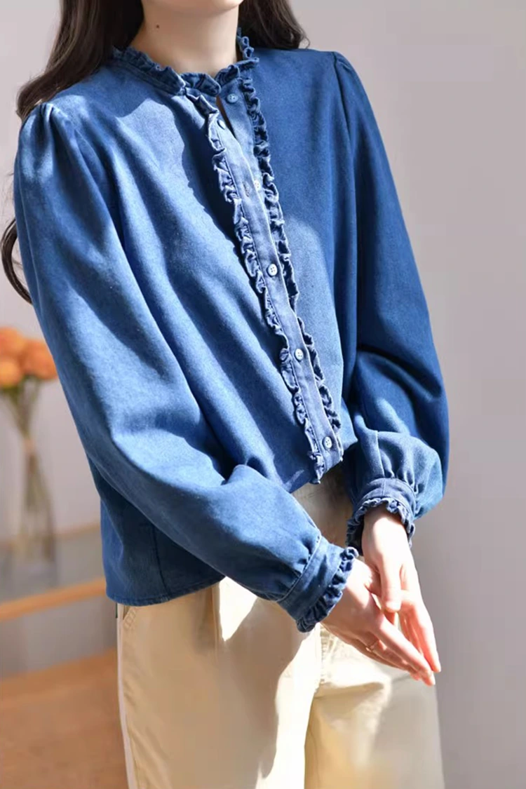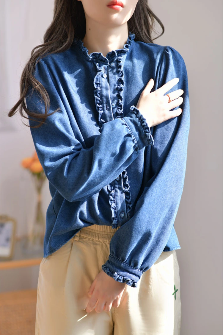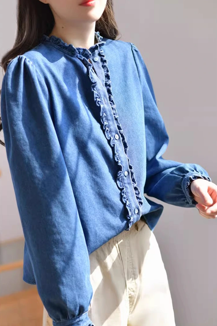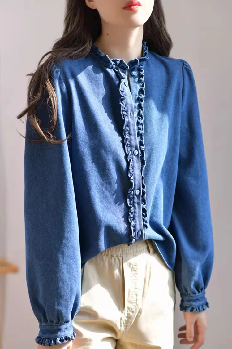 Denim Casual Bluse til kvinder har et retro og afslappet mønsterdesign, der passer præcist til formen på kvinders kroppe. Det afhænger ikke af kropstype og kan ikke kun forfine skulder- og nakkelinjerne, men også skjule det overskydende fedt på taljen og maven. Den opfylder behovene hos forskellige kropstyper. Kraven er designet som en stand-up krave, parret med udsøgte flæsede kanter. Den forreste åbning og manchetterne er også dekoreret med sarte flæsede kanter. Kombineret med de fluffy og lanterneformede lange ærmer, kombinerer den perfekt retro elegance og afslappet lethed. Det enkle ensfarvede mønster er klassisk og holdbart, og går ikke af mode. Det kan skabe et dagligt afslappet look eller en enkel forretningsstil og er yderst praktisk.