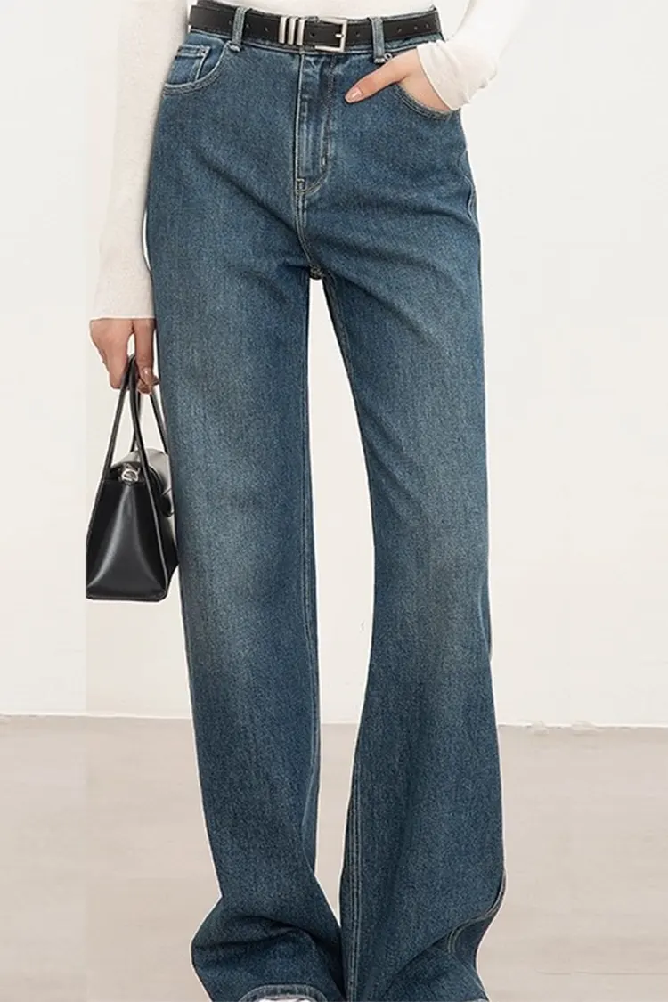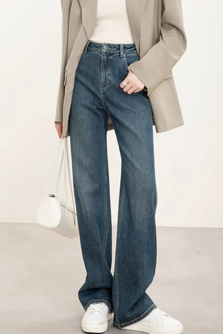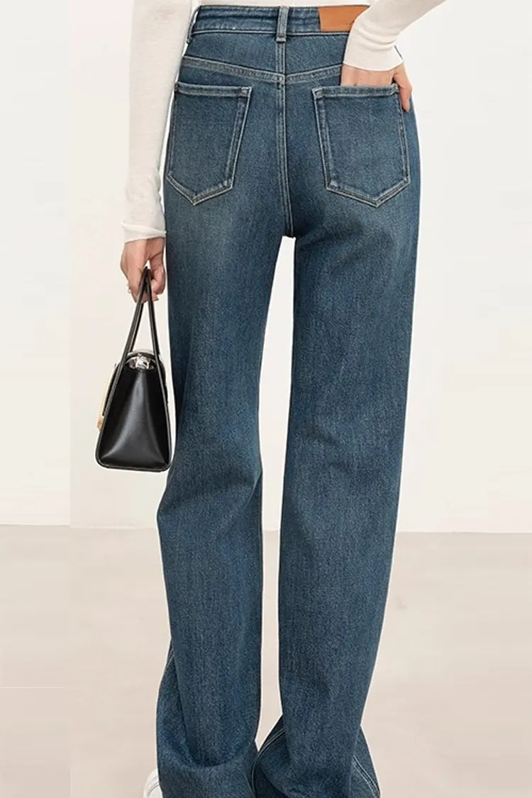 Dame-denimbukser med lige ben er lavet af et blandet stof af høj kvalitet bestående af 69% bomuld, 30% polyester og 1% spandex. Den tilbyder fremragende åndbarhed, holdbarhed og moderat elasticitet, hvilket giver en behagelig oplevelse hele dagen.